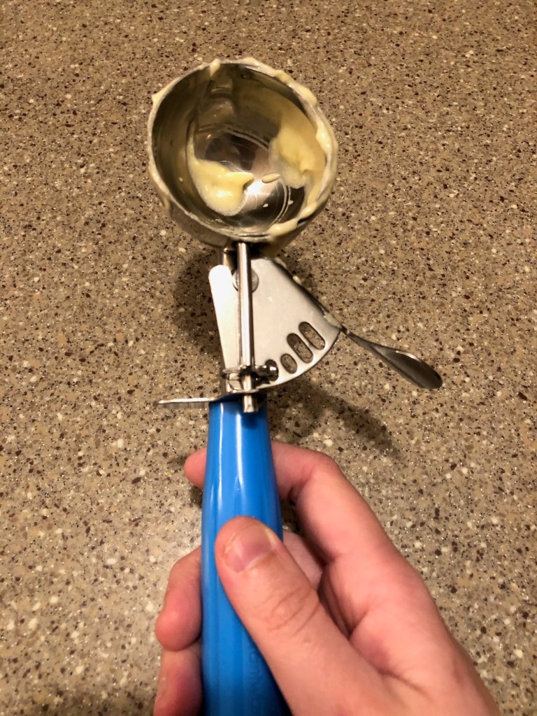 This thing is such an amazing tool for dividing up cake batter, I put 6 scoops per pan and then smoothed out the tops with a spatula so they all bake nice and even.