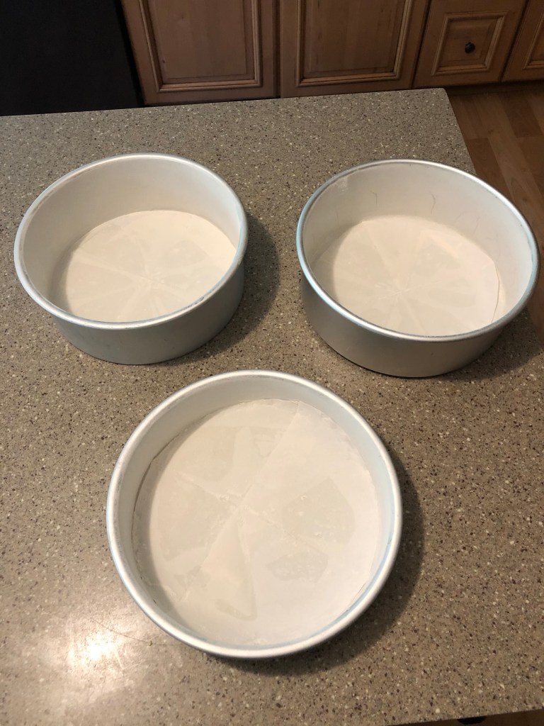 Preheat oven to 350 degrees F or 176 degrees C, then lightly spray with baking spray and line the bottom of three 8 inch round cake pans with parchment paper and dust with a small amount of flour. Set aside.