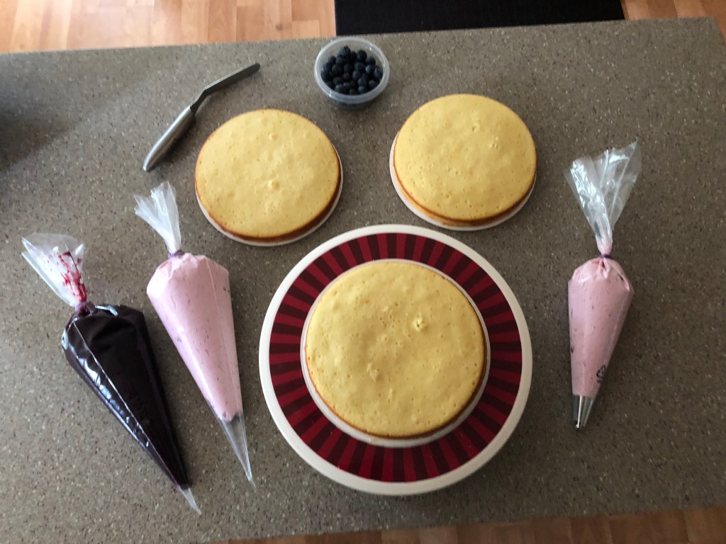 Start by adding a small amount of the buttercream to the piping bag fitted with the piping tip, then take the other 2, fill one with the rest of the buttercream and the other with the blueberry filling. I tied the tops of my piping bags with rubber bands so nothing comes out the top of the bags. Now take one of the cake layers, place it on the cake board and put the cake board on the turntable (if using.) Begin by piping a “fence” around the edge of the cake to keep the filling from spilling out the sides of the cake.