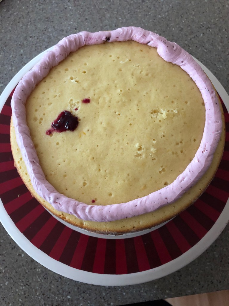 I did add the blueberry filling to this buttercream, I just forgot to take a picture of it. Now onto assembling this gorgeous cake.